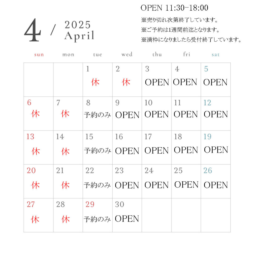 毎月第1週目は事務作業などの為、木~土曜日の営業日となっております。
