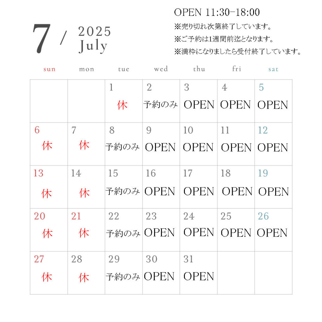 7月の店舗販売日。