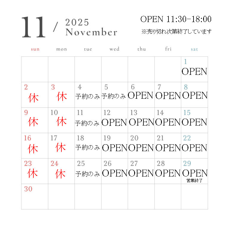 下記に、11月の店舗販売日カレンダーを掲載いたします。