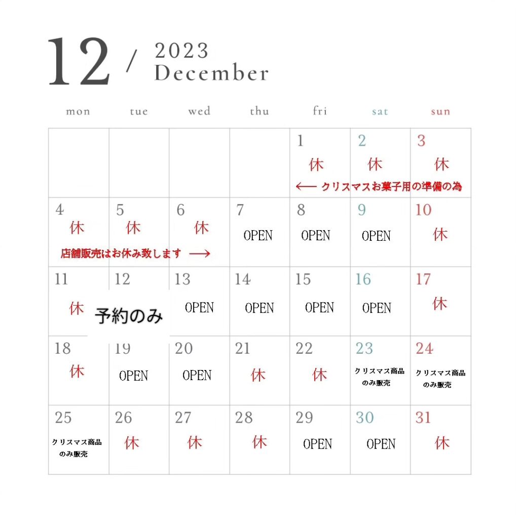 12月はクリスマスなどの関係で店舗販売日が不定期となります。