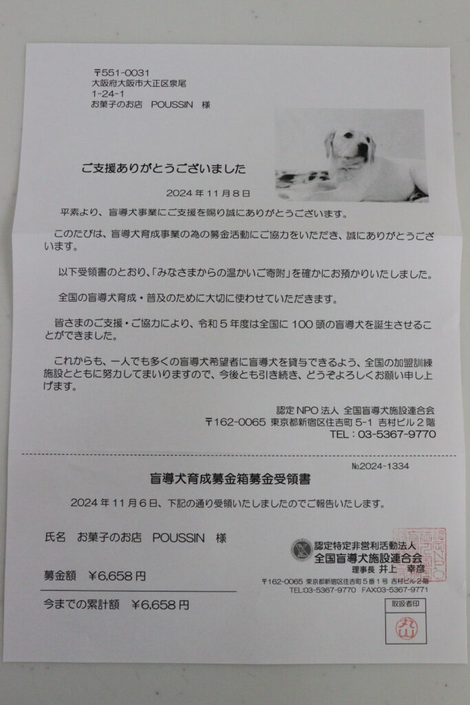 この度、店内設置しております盲導犬育成募金箱の集計を行いました。